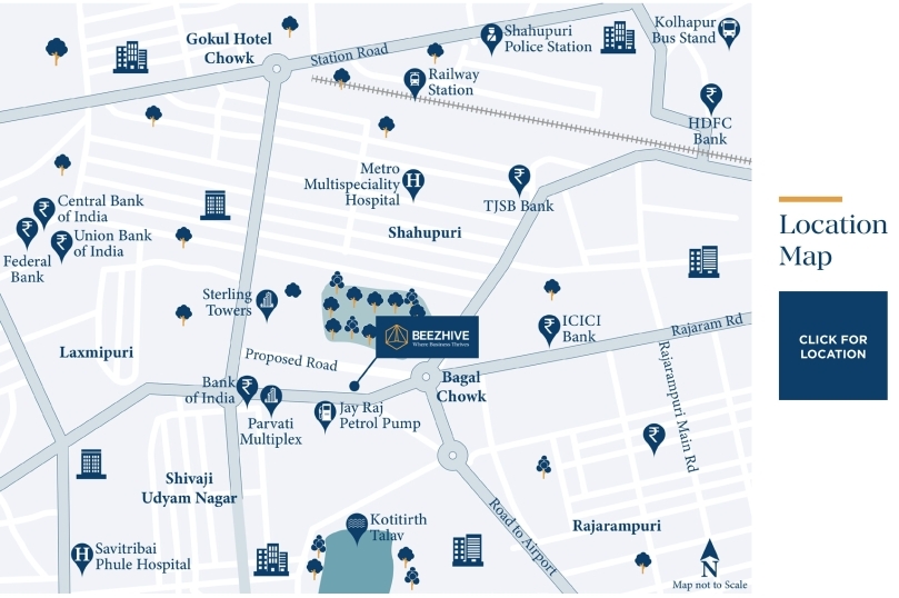 Beezhive is Kolhapur’s premier business hub, a space where businesses can work and thrive. The project accommodates a wide variety of options for various shop and office space needs. Conveniently located in the city centre, the Beezhive is well connected with the other main business areas of the city.